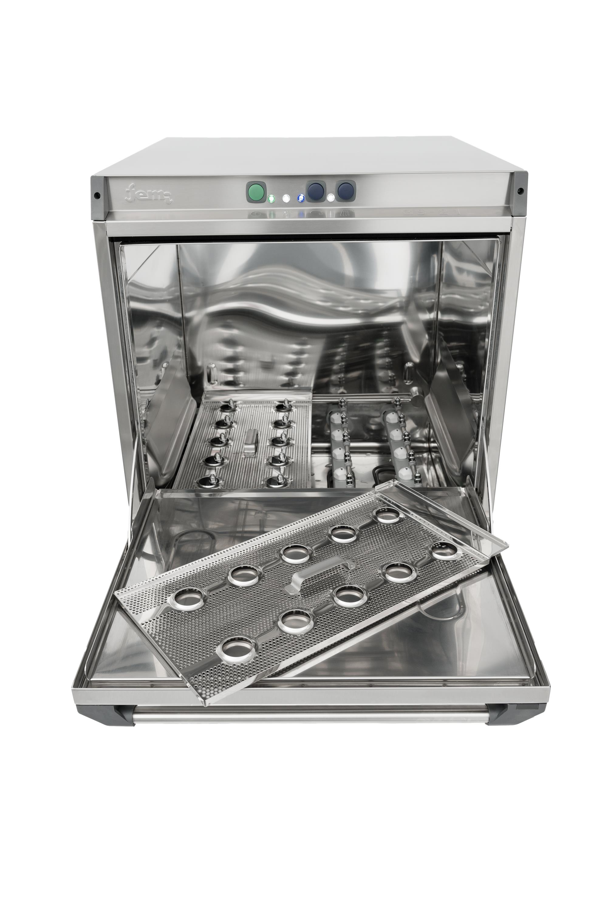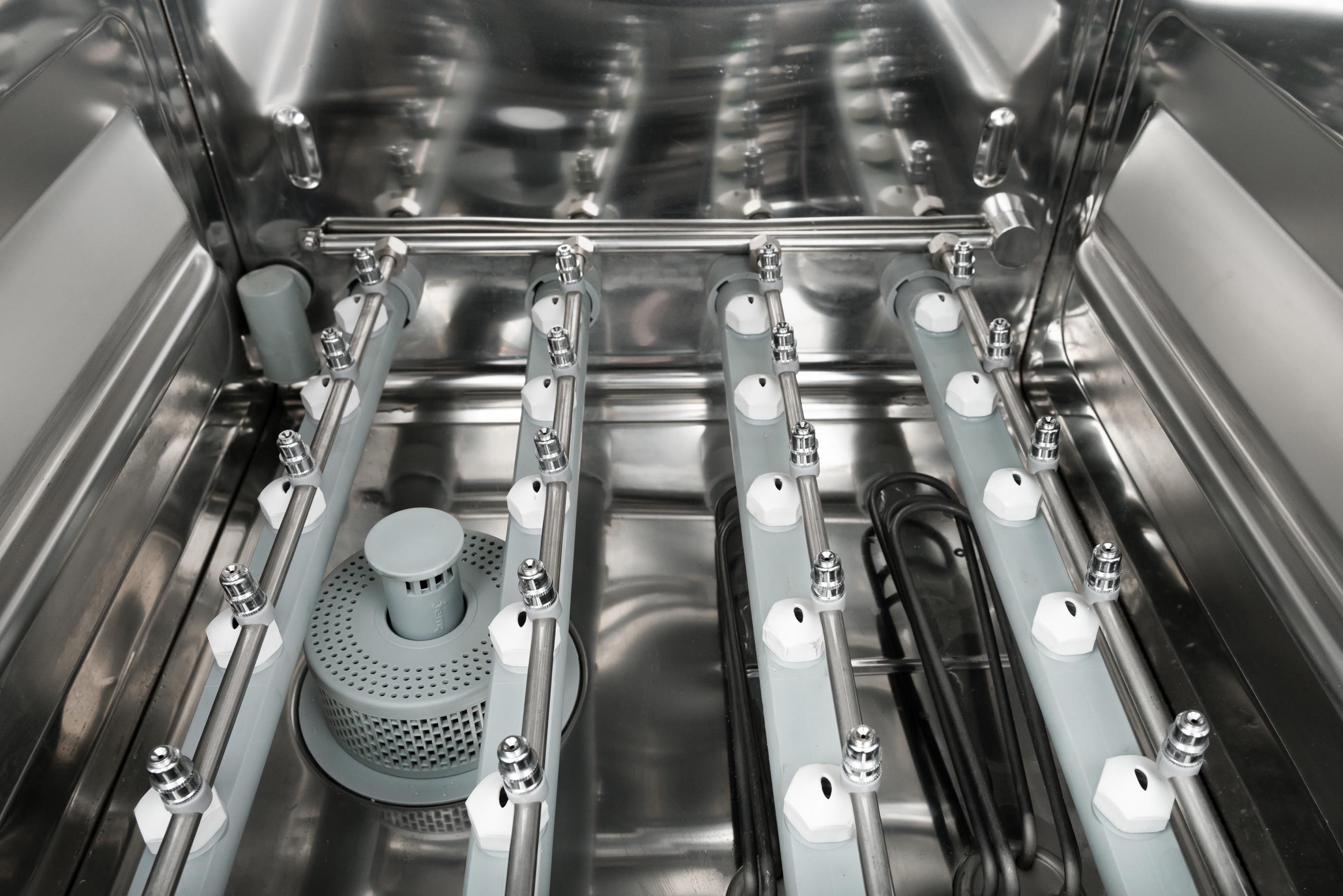 2 separate rinsing processes (washing and rinsing) guarantee hygiene at highest level also for small quantities of wash items. Efficient and cost efficient. The strainer makes sure that detached labels from the bottles do not enter into the detergent solution.